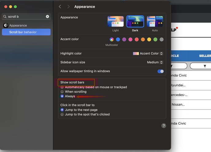 - Set "Show scroll bars": Look for the "Show scroll bars" option and select Always.